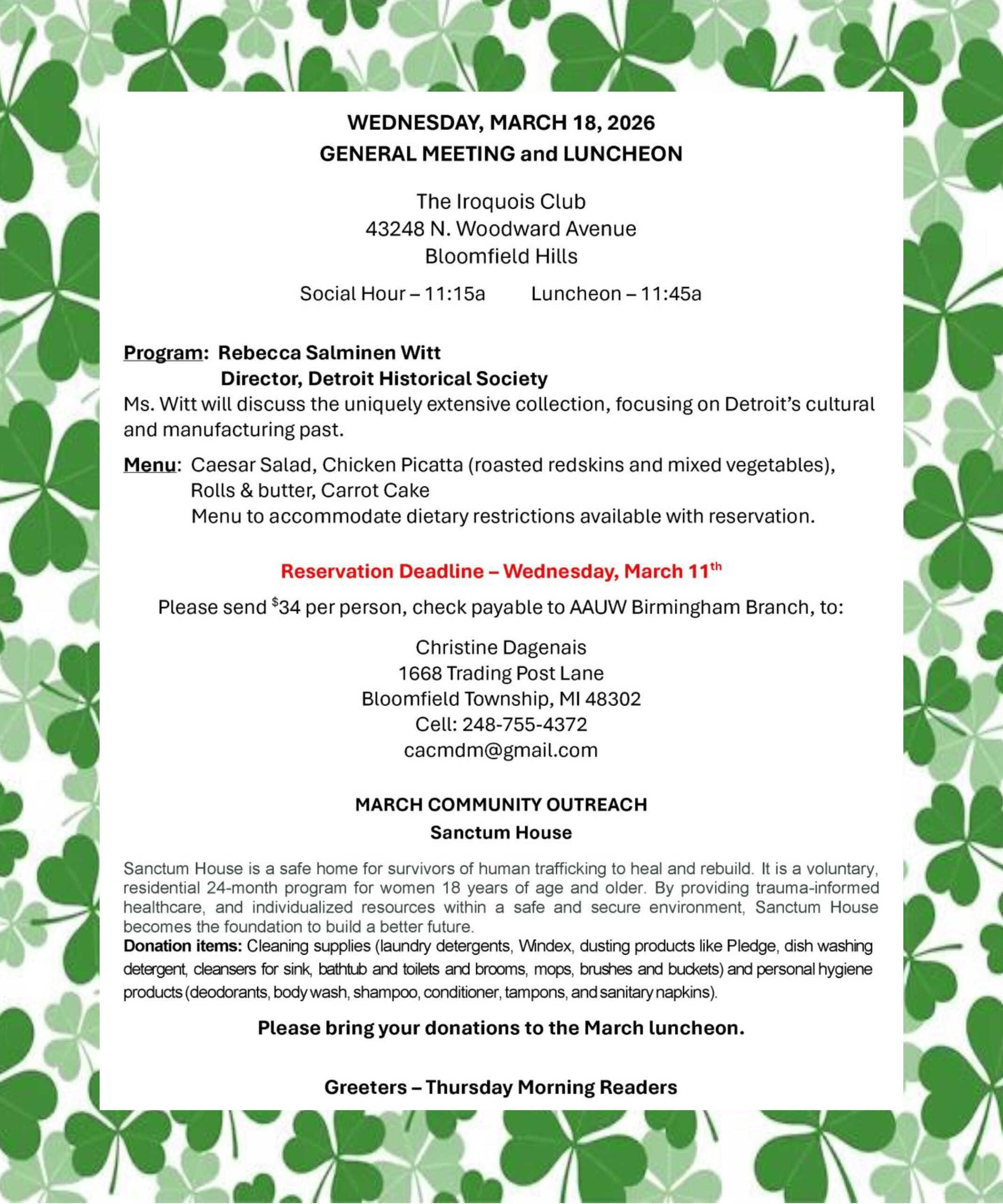 Interested? Contact Sally Doty 248) 909-4583 sallyaauw@gmail.com or Cindi Hopkins (248) 924-7008 hopkins3190@gmail.com